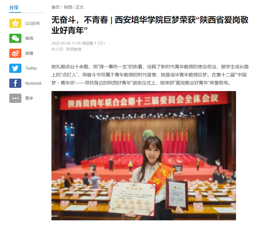她扎根讲台十余载,用“择一事终一生”的执着,诠释了新时代青年教师的使命担当,做学生成长路上的“点灯人”,用奋斗书写属于青年教师的时代答卷,她是培华青年教师巨梦。在第十二届"'中国梦?青年志'——寻找身边的陕西好青年"颁奖仪式上,她荣获“爱岗敬业好青年”荣誉称号。