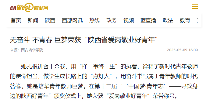 她扎根讲台十余载,用“择一事终一生”的执着,诠释了新时代青年教师的使命担当,做学生成长路上的“点灯人”,用奋斗书写属于青年教师的时代答卷,她是培华青年教师巨梦。在第十二届"'中国梦?青年志'——寻找身边的陕西好青年"颁奖仪式上,她荣获“爱岗敬业好青年”荣誉称号。
