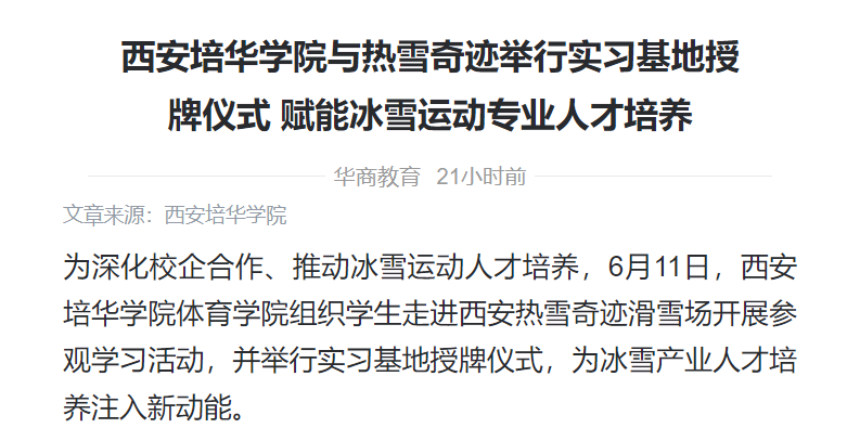 此次活动是西安培华学院践行“产教融合、协同育人”理念的重要举措,为校企双方建立长期稳定的合作关系奠定了基础。未来,学校将继续深化与热雪奇迹等企业的合作,持续探索人才培养模式,为推动冰雪运动产业发展输送更多优秀人才。