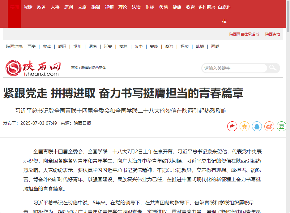 全国青联十四届全委会、全国学联二十八大7月2日上午在京开幕。习近平总书记发来贺信,代表党中央表示祝贺,向全国各族各界青年和青年学生、向广大海外中华青年致以问候。习近平总书记的贺信在陕西引起热烈反响。大家纷纷表示,要认真学习习近平总书记贺信精神,牢记总书记教导,立志做有理想、敢担当、能吃苦、肯奋斗的新时代好青年,以强国建设、民族复兴伟业为己任,在推进中国式现代化的新征程上奋力书写挺膺担当的青春篇章。