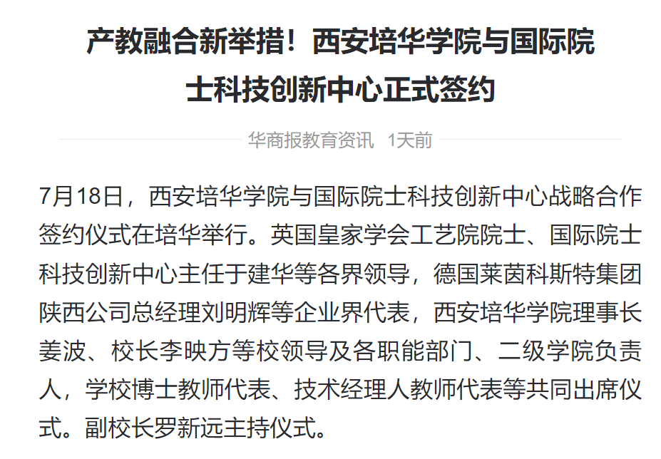 据悉,作为中华职业教育社在陕西省的唯一延续学校,西安培华学院始积极践行“手脑并用”“做学合一”的职教理念,将深化产教融合、校企合作作为立校之本与发展引擎。多年来,通过精准对接区域产业发展需求,培华学院在引育高端人才和搭建育人平台方面取得了显著成效。
