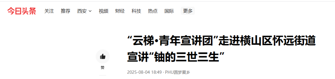 8月4日,“云梯·青年宣讲团”走进横山区怀远街道能源路社区,为社区居民带来了一场主题为“铀的三世三生”的精彩科普宣讲,将深奥的核能与核工业知识转化为通俗易懂的科学故事,在基层社区播撒下探索科学的火种。