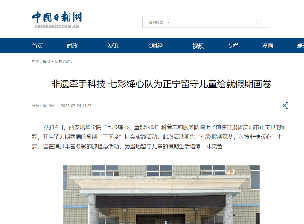 7月14日,西安培华学院“七彩绛心,童趣假期”科普志愿服务队踏上了前往甘肃省庆阳市正宁县的征程,开启了为期两周的暑期“三下乡”社会实践活动。此次活动聚焦“七彩假期筑梦,科技非遗暖心”主题,旨在通过丰富多彩的课程与活动,为当地留守儿童的假期生活增添一抹亮色。