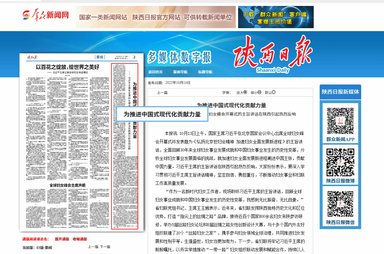 10月13日上午,国家主席习近平在北京国家会议中心出席全球妇女峰会开幕式并发表题为《弘扬北京世妇会精神 加速妇女全面发展新进程》的主旨讲话,全面回顾30年来全球妇女事业发展成就和中国妇女事业发生的历史性变革,分析全球妇女事业发展面临的挑战,就加速妇女全面发展新进程阐述中国主张,贡献中国力量。习近平主席的主旨讲话在陕西引起热烈反响,大家纷纷表示,要深入学习贯彻习近平主席主旨讲话精神,坚定自信、勇担重任,不断推动妇女事业和妇联工作高质量发展。“作为一名新时代妇女工作者,现场聆听习近平主席的主旨讲话,回顾全球妇女事业成就和中国妇女事业发生的历史性变革,我感到无比振奋、无比自豪。”省妇联党组书记、主席王玉娥表示,近年来,省妇联发挥陕西独特历史文化和区位优势,打造“指尖上的丝绸之路”品牌,接待近百个国家800余名妇女来陕参访研修,举办5届丝路妇女论坛和8届丝绸之路女性创新设计大赛,与十多个国内外友好组织联建了20个“丝路妇女之家”,携手参与妇女领域全球治理,共同推进妇女发展和性别平等。生逢盛世,妇女当更加有为。下一步,省妇联将牢记习近平主席的殷殷嘱托,以务实举措推动“一带一路”妇女组织联动发展和赋能合作,持续以人文交流促民心相通,以交流互鉴促携手共赢,为助推全球妇女事业发展贡献陕西女性力量。