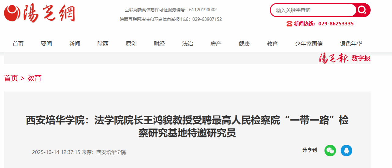 2025年9月,西安培华学院法学院院长王鸿貌教授正式受聘为最高人民检察院“一带一路”检察研究基地特邀研究员。此次聘任是对王鸿貌教授在法学领域,尤其是税务治理研究方面学术成就及社会影响力的高度认可,同时也彰显了西安培华学院法学院的办学实力与学科建设水平。