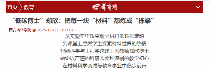 西安培华学院智能科学与工程学院建工系教师郑欣博士,始终以严谨的科研态度与温暖的教学初心,在材料科学领域与教育事业中稳步前行。她深耕纳米复合粉体技术、耐火材料固废利用等研究方向,用成果回应行业需求;以“知行合一”的教学理念,为学生搭建从理论到实践的桥梁,诠释着青年学者与高校教师的双重担当。