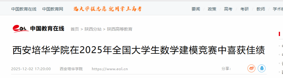 近日,陕西省教育厅发布《关于公布2025年全国大学生数学建模竞赛陕西赛区获奖名单》(陕教高办〔2025〕30号),培华学子在本次竞赛中取得优异成绩,共21支参赛队获奖,其中获得国家二等奖4项,省一等奖7项,省二等奖10项,西安培华学院被评为优秀组织先进单位。
