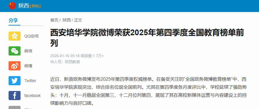 近日,新浪政务微博发布2025年第四季度权威榜单。在备受关注的“全国政务微博教育榜单”中,西安培华学院表现突出,综合排名位居全国前列。尤其在第四季度各月度评比中,学校延续了强劲势头:十月、十一月稳居全国第三,十二月位列第四,展现了其在高校新媒体运营与内容建设上的持续影响力与良好口碑。