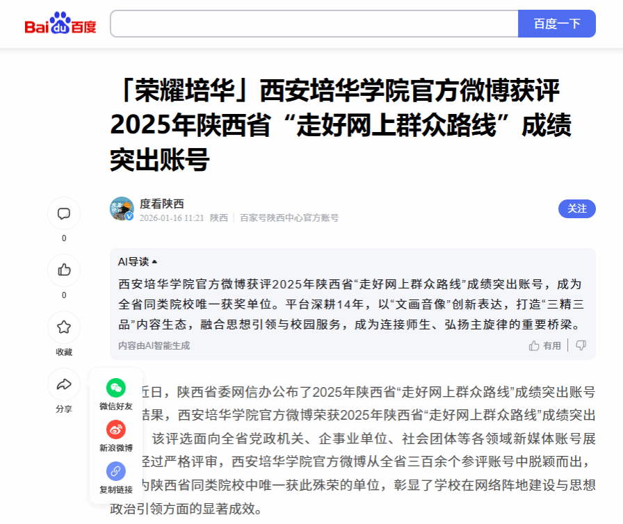 近日,陕西省委网信办公布了2025年陕西省“走好网上群众路线”成绩突出账号推选结果,西安培华学院官方微博荣获2025年陕西省“走好网上群众路线”成绩突出账号。该评选面向全省党政机关、企事业单位、社会团体等各领域新媒体账号展开,经过严格评审,西安培华学院官方微博从全省三百余个参评账号中脱颖而出,并成为陕西省同类院校中唯一获此殊荣的单位,彰显了学校在网络阵地建设与思想政治引领方面的显著成效。