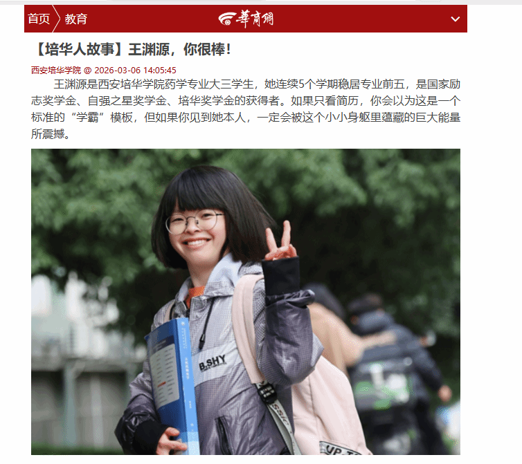 在西安培华学院,有一位叫王渊源的大三女生。如果只看简历她连续5个学期稳居专业前五,国家励志奖学金获得者,三项国家级奖项,十余项省级荣誉,你会以为这是一个标准的“学霸”模板。