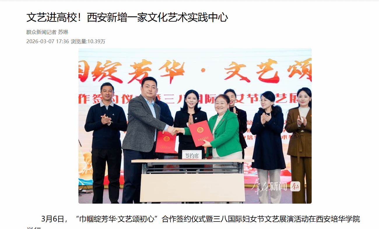 活动当天,西安市文艺两新联合会与西安培华学院正式签署文化合作战略协议,并共同为“文化艺术实践中心”揭牌。该中心将成为推动文艺资源与教育优势深度融合的重要载体,助力学生提升文化素养与艺术实践能力。