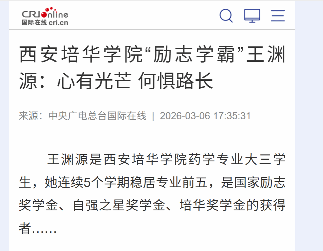 王渊源是西安培华学院药学专业大三学生,她连续5个学期稳居专业前五,是国家励志奖学金、自强之星奖学金、培华奖学金的获得者……