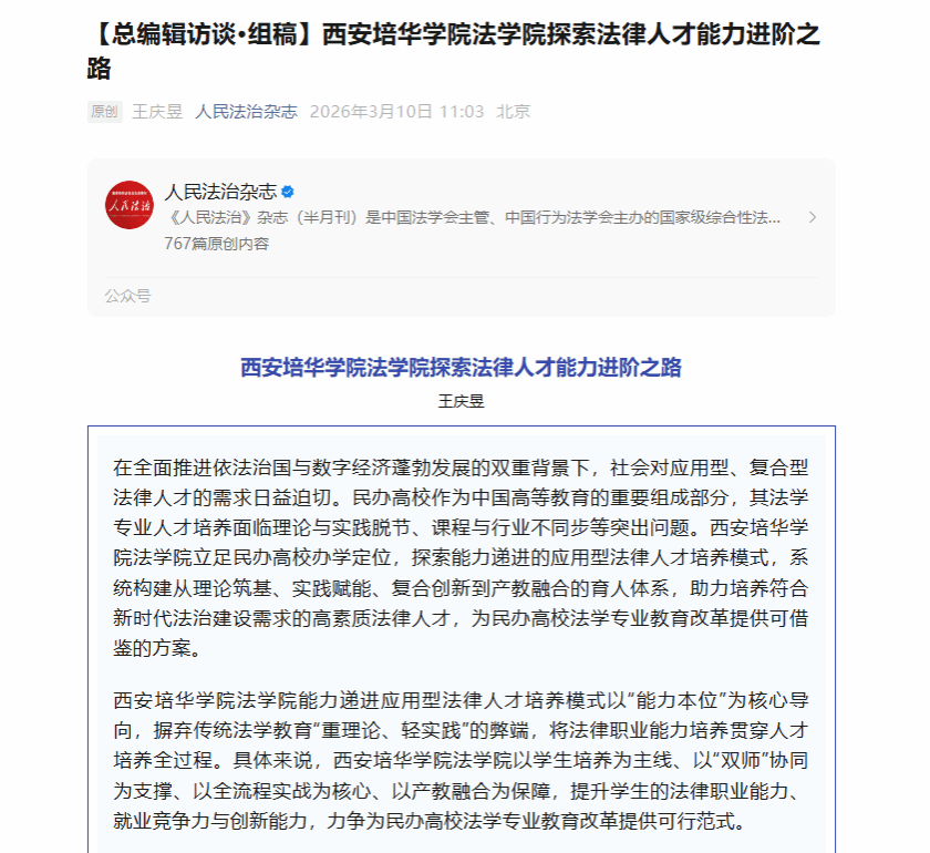 西安培华学院法学院能力递进应用型法律人才培养模式立足民办高校办学定位,以产教融合为纽带,精准对接社会法治需求,通过科学划分培养阶段、创新实践路径、构建协同机制,有效破解了传统法学教育的突出难题。未来,西安培华学院法学院将持续优化能力递进模式,进一步加强跨学科课程建设、深化政产学研用协同合作、完善能力考核评价体系、提升师资队伍水平,不断提升应用型法律人才培养质量,为全面推进依法治国、区域法治建设输送更多高素质法治人才。