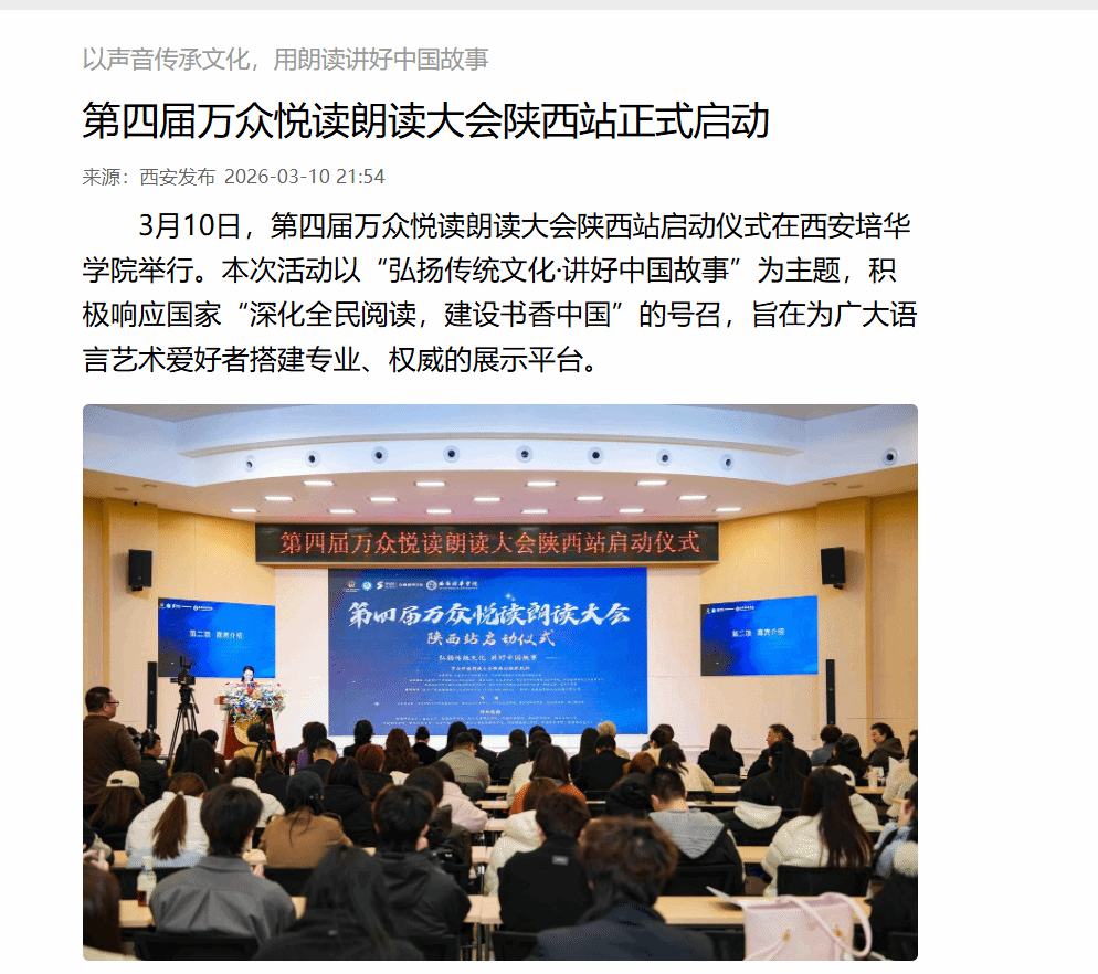 3月10日,第四届万众悦读朗读大会陕西站启动仪式在西安培华学院举行。本次活动以“弘扬传统文化·讲好中国故事”为主题,积极响应国家“深化全民阅读,建设书香中国”的号召,旨在为广大语言艺术爱好者搭建专业、权威的展示平台。