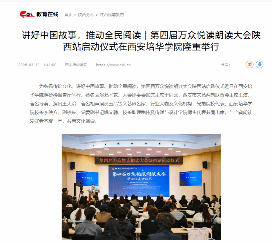 在西安培华学院成功举办的第四届万众悦读朗读大会陕西站启动仪式,既是一场高水平的文化盛会,也是学校深耕语言艺术教育的重要实践。以此为契机,学校为播音学子搭建了与行业名家交流的平台,让同学们在实战中感受艺术魅力。随着赛事全面展开,学校将继续坚持以赛促学、以赛育人,引导学子在锤炼专业本领的同时,用声音讲好中国故事、陕西故事。未来,培华将进一步深化产教融合,为传承中华优秀传统文化、推动全民阅读贡献培华力量。