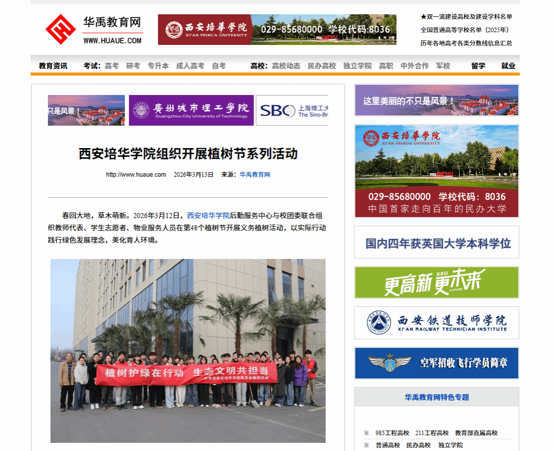 春回大地,草木萌新。2026年3月12日,西安培华学院后勤服务中心与校团委联合组织教师代表、学生志愿者、物业服务人员在第48个植树节开展义务植树活动,以实际行动践行绿色发展理念,美化育人环境。