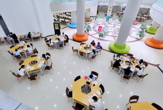 学校里最美的风景,私以为是维之图书馆。这里建筑面积2.7万平方米,馆藏纸质图书250.15万册,只要你愿意,随时都能沉浸在知识的真·海洋里。