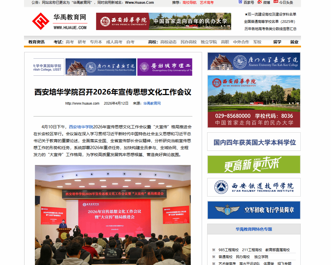4月10日下午,西安培华学院2026年宣传思想文化工作会议暨“大宣传”格局推进会在长安校区举行。会议旨在深入学习贯彻习近平新时代中国特色社会主义思想和习近平总书记关于教育的重要论述,全面落实全国、全省宣传部长会议精神,分析研究当前宣传思想工作的形势和任务,系统部署2026年重点任务,加快构建全员参与、全域协同、全程发力的“大宣传”工作格局,为学校高质量发展筑牢思想根基、营造良好舆论氛围。