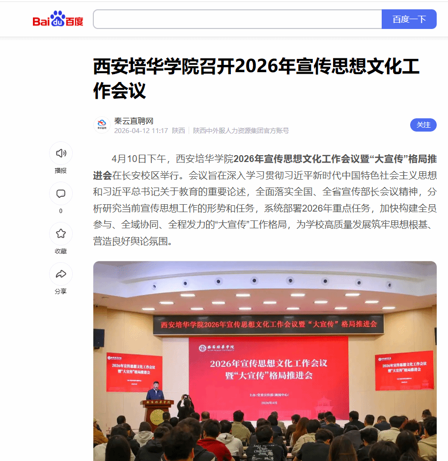 4月10日下午,西安培华学院2026年宣传思想文化工作会议暨“大宣传”格局推进会在长安校区举行。会议旨在深入学习贯彻习近平新时代中国特色社会主义思想和习近平总书记关于教育的重要论述,全面落实全国、全省宣传部长会议精神,分析研究当前宣传思想工作的形势和任务,系统部署2026年重点任务,加快构建全员参与、全域协同、全程发力的“大宣传”工作格局,为学校高质量发展筑牢思想根基、营造良好舆论氛围。
