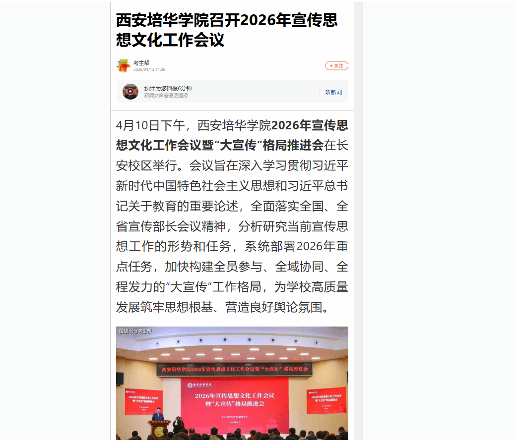 4月10日下午,西安培华学院2026年宣传思想文化工作会议暨“大宣传”格局推进会在长安校区举行。会议旨在深入学习贯彻习近平新时代中国特色社会主义思想和习近平总书记关于教育的重要论述,全面落实全国、全省宣传部长会议精神,分析研究当前宣传思想工作的形势和任务,系统部署2026年重点任务,加快构建全员参与、全域协同、全程发力的“大宣传”工作格局,为学校高质量发展筑牢思想根基、营造良好舆论氛围。