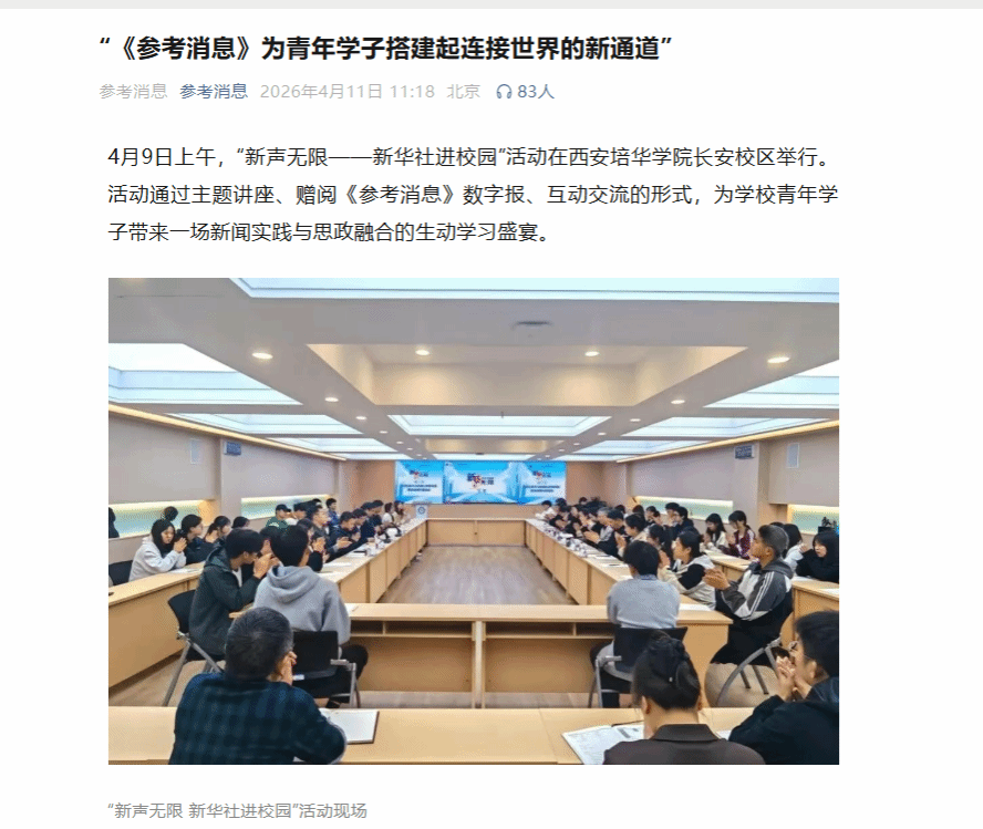 4月9日上午,“新声无限——新华社进校园”活动在西安培华学院长安校区举行。活动通过主题讲座、赠阅《参考消息》数字报、互动交流的形式,为学校青年学子带来一场新闻实践与思政融合的生动学习盛宴。