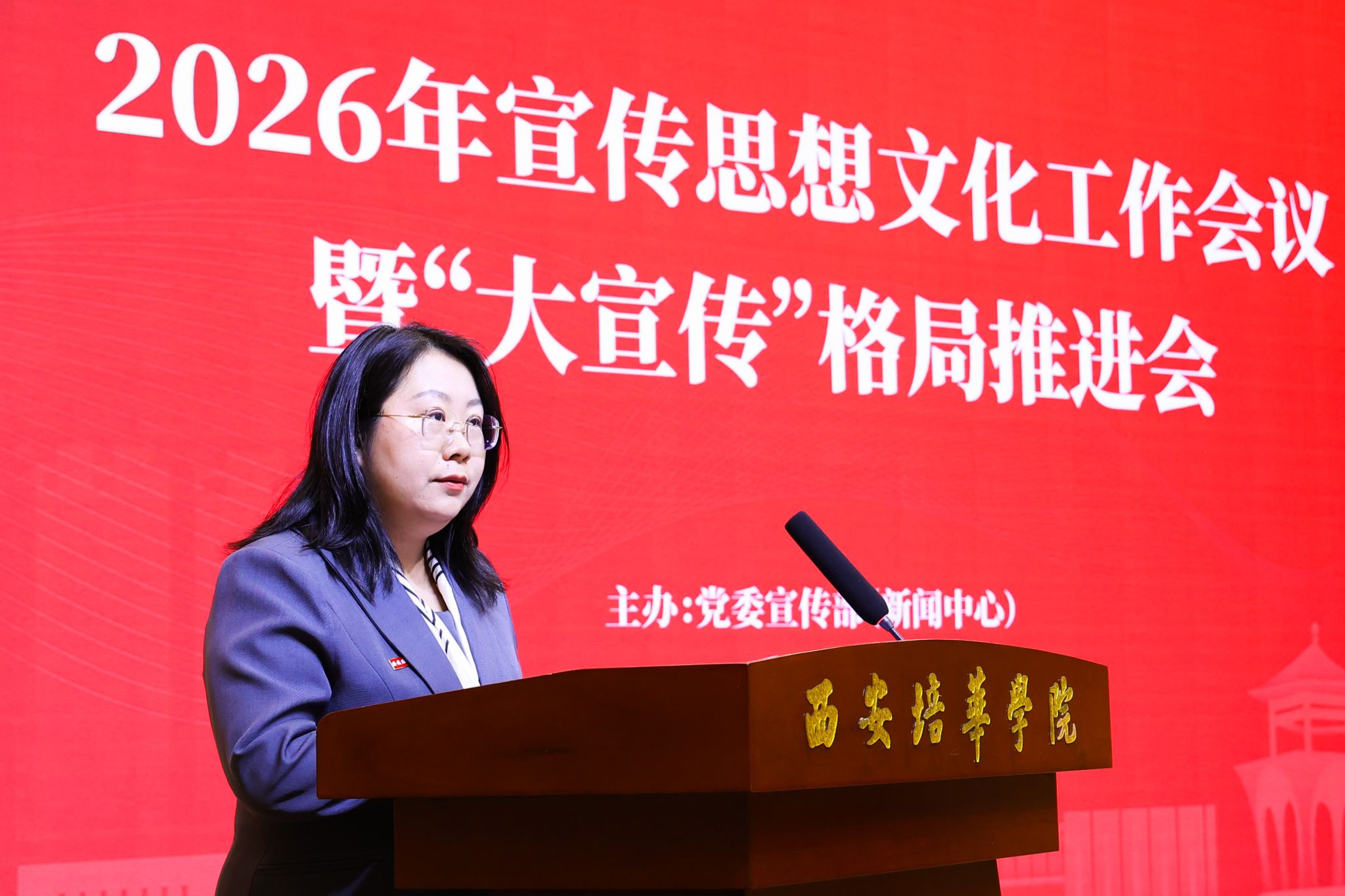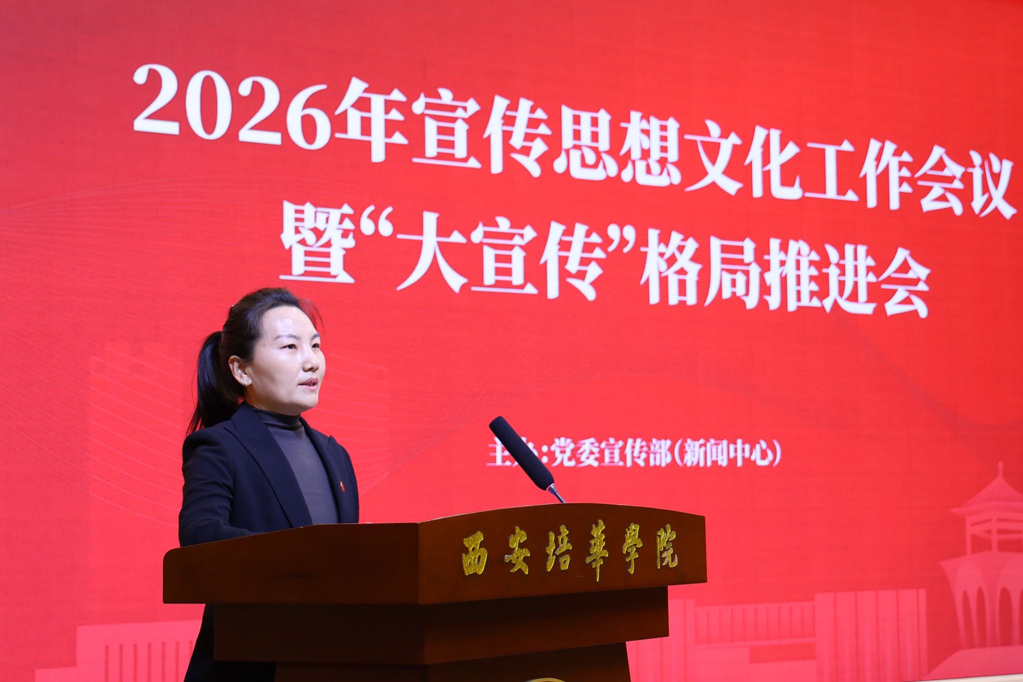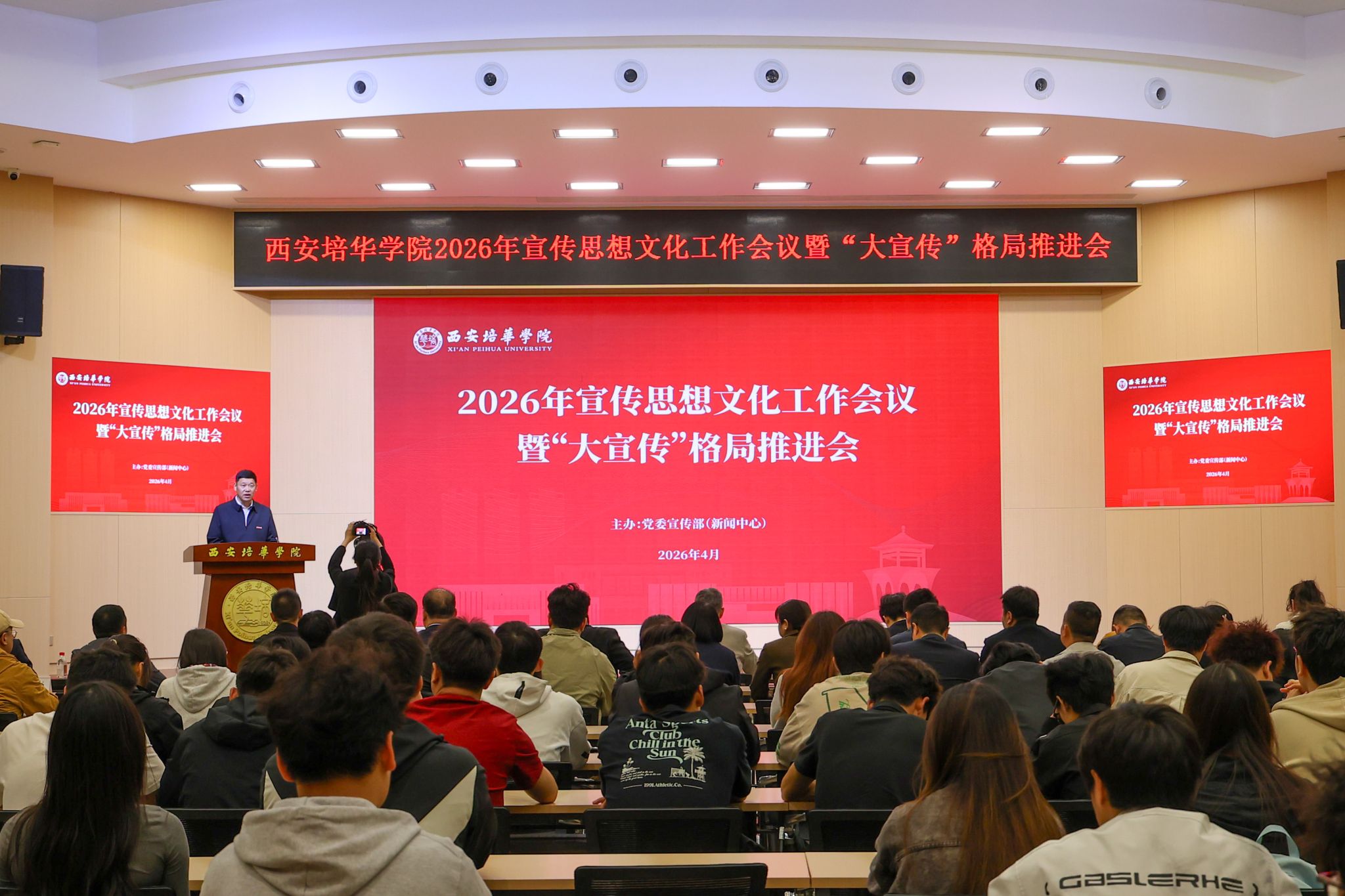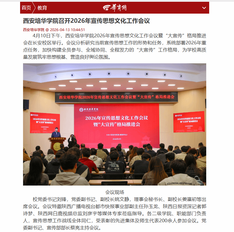 4月10日下午,西安培华学院2026年宣传思想文化工作会议暨“大宣传”格局推进会在长安校区举行。会议分析研究当前宣传思想工作的形势和任务,系统部署2026年重点任务,加快构建全员参与、全域协同、全程发力的“大宣传”工作格局,为学校高质量发展筑牢思想根基、营造良好舆论氛围。