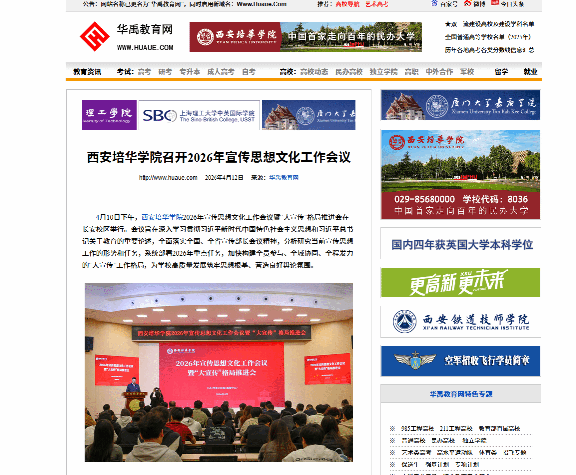 4月10日下午,西安培华学院2026年宣传思想文化工作会议暨“大宣传”格局推进会在长安校区举行。会议旨在深入学习贯彻习近平新时代中国特色社会主义思想和习近平总书记关于教育的重要论述,全面落实全国、全省宣传部长会议精神,分析研究当前宣传思想工作的形势和任务,系统部署2026年重点任务,加快构建全员参与、全域协同、全程发力的“大宣传”工作格局,为学校高质量发展筑牢思想根基、营造良好舆论氛围。