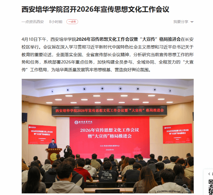 4月10日下午,西安培华学院2026年宣传思想文化工作会议暨“大宣传”格局推进会在长安校区举行。会议旨在深入学习贯彻习近平新时代中国特色社会主义思想和习近平总书记关于教育的重要论述,全面落实全国、全省宣传部长会议精神,分析研究当前宣传思想工作的形势和任务,系统部署2026年重点任务,加快构建全员参与、全域协同、全程发力的“大宣传”工作格局,为学校高质量发展筑牢思想根基、营造良好舆论氛围。