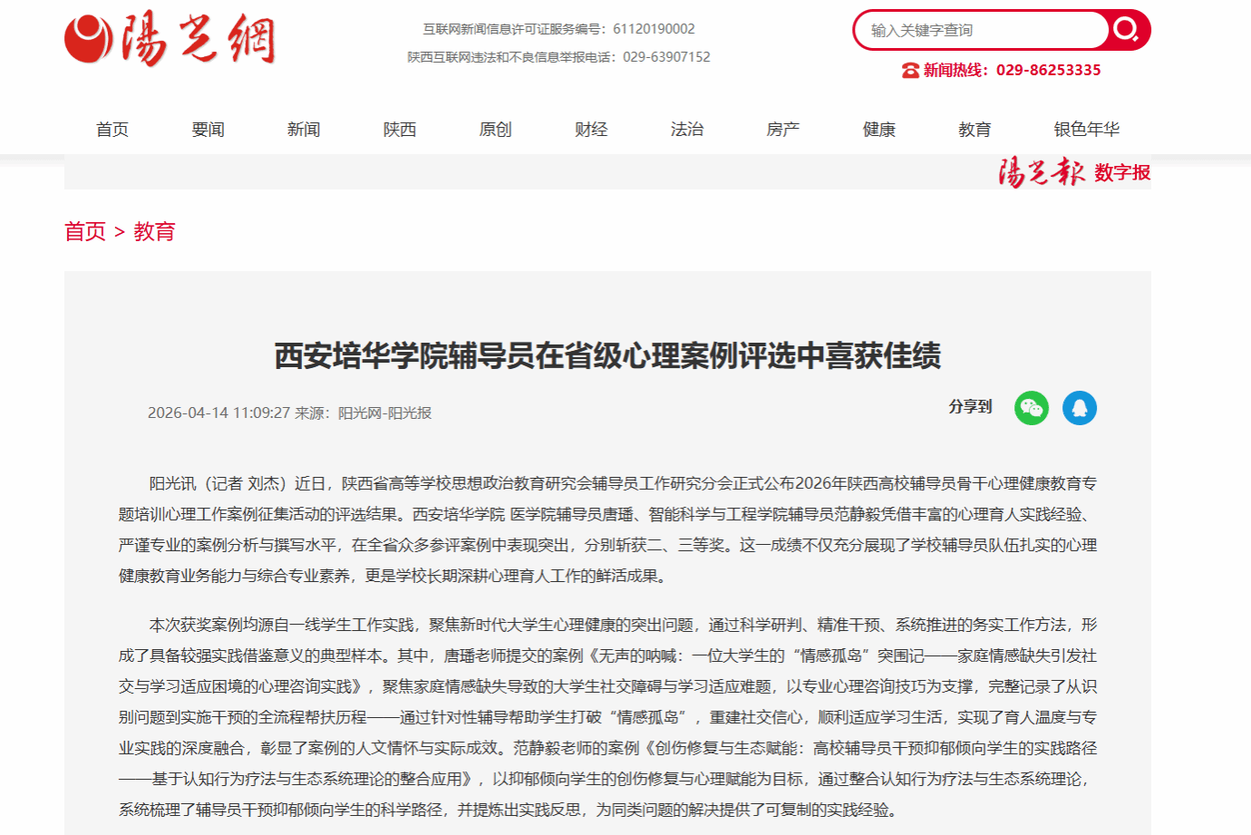 近日,陕西省高等学校思想政治教育研究会辅导员工作研究分会正式公布2026年陕西高校辅导员骨干心理健康教育专题培训心理工作案例征集活动评选结果。西安培华学院医学院辅导员唐璠、智能科学与工程学院辅导员范静毅凭借凭借丰富的心理育人实践经验、严谨专业的案例分析与撰写水平,在全省众多参评案例中表现突出,分别斩获二、三等奖。这一成绩不仅充分展现了学校辅导员队伍扎实的心理健康教育业务能力与综合专业素养,更是学校长期深耕心理育人工作的鲜活成果。