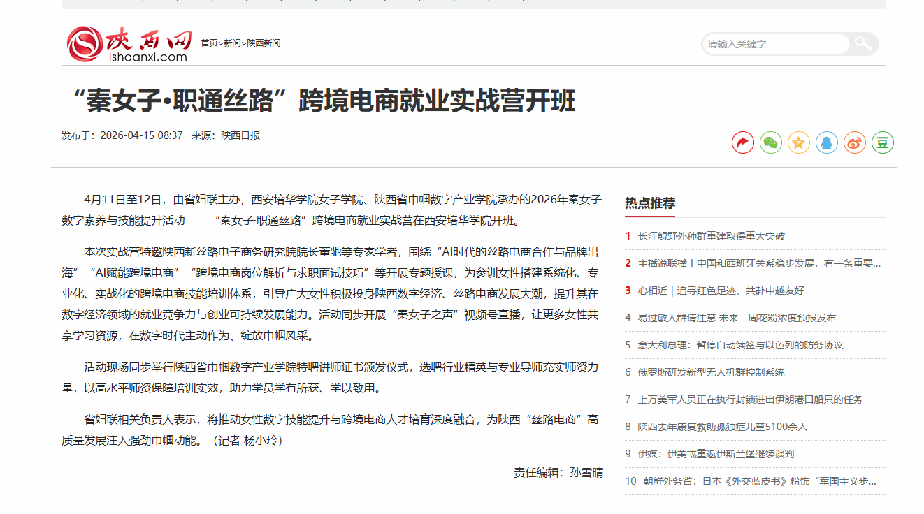 4月11日至12日,由省妇联主办,西安培华学院女子学院、陕西省巾帼数字产业学院承办的2026年秦女子数字素养与技能提升活动——“秦女子·职通丝路”跨境电商就业实战营在西安培华学院开班。