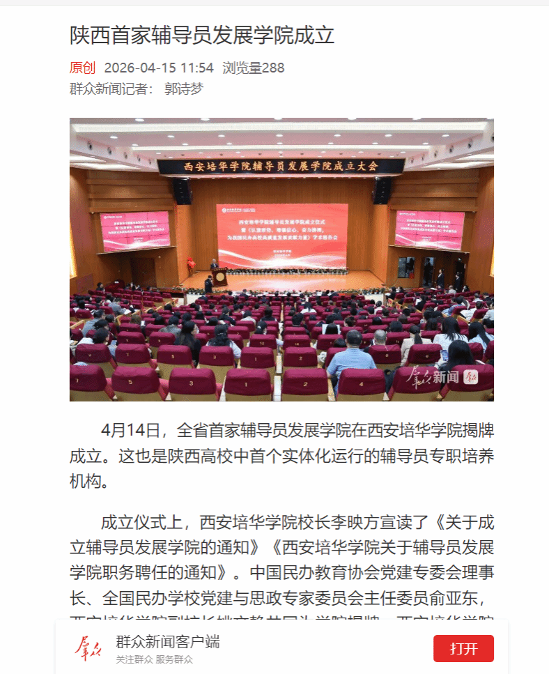 西安培华学院辅导员发展学院,是陕西高校中首个实体化运行的辅导员专职培养机构。学院深入贯彻落实《全面加强新时代高校辅导员队伍建设行动方案》精神,是学校着力建强新时代高校思想政治工作“第四支队伍”的标志性实践举措。学院下设辅导员发展研究中心、辅导员培训与培养中心、辅导员实践创新中心,聚焦“新苗—成长—骨干—专家”分层分类培养,模块化精品课程体系构建、辅导员工作室与特色项目孵化、科研赋能与实践创新融合四大核心任务系统发力。(作者:苏成君)