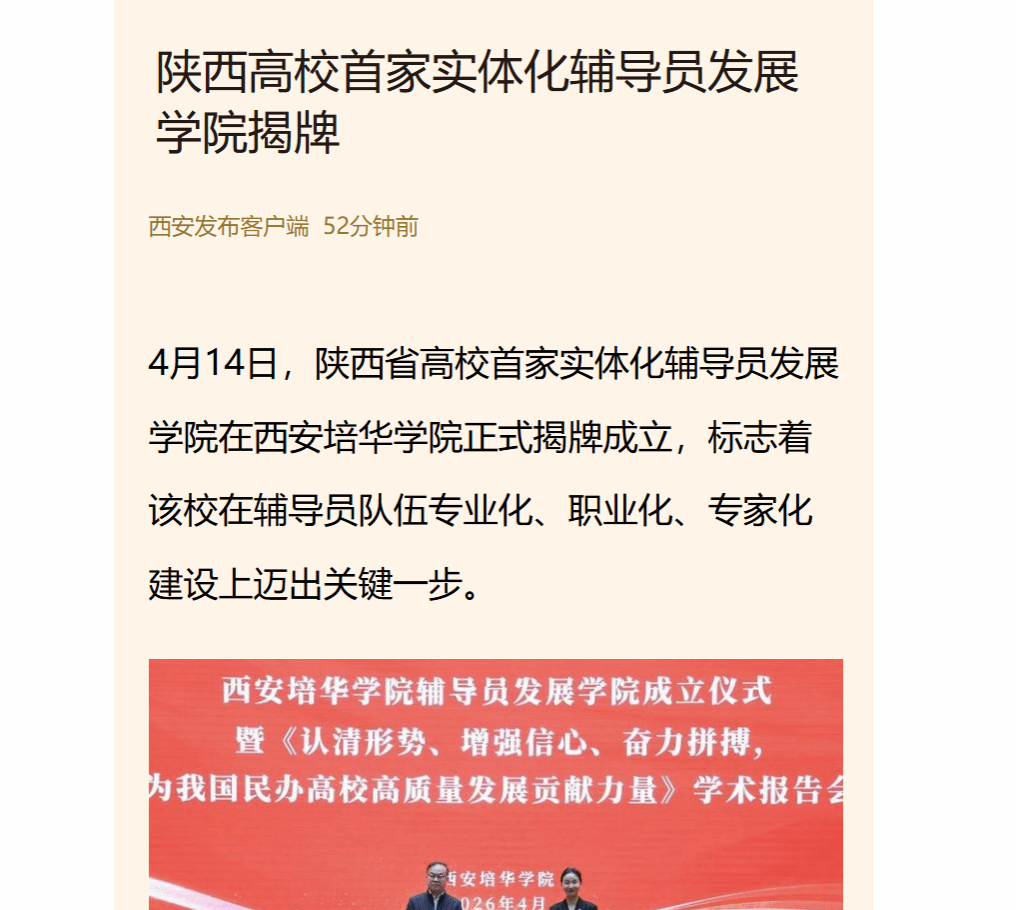 西安培华学院辅导员发展学院,是陕西高校中首个实体化运行的辅导员专职培养机构。学院深入贯彻落实《全面加强新时代高校辅导员队伍建设行动方案》精神,是学校着力建强新时代高校思想政治工作“第四支队伍”的标志性实践举措。学院下设辅导员发展研究中心、辅导员培训与培养中心、辅导员实践创新中心,聚焦“新苗—成长—骨干—专家”分层分类培养,模块化精品课程体系构建、辅导员工作室与特色项目孵化、科研赋能与实践创新融合四大核心任务系统发力。(作者:苏成君)