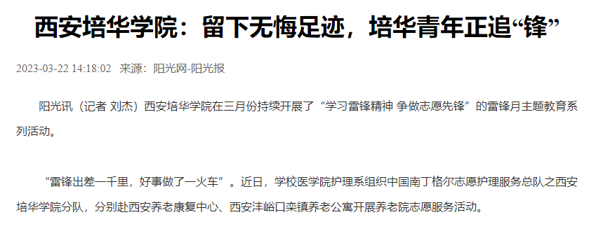 阳光讯(记者 刘杰)西安培华学院在三月份持续开展了“学习雷锋精神 争做志愿先锋”的雷锋月主题教育系列活动。