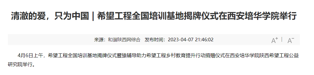据悉,此次挂牌的希望工程全国培训基地坐落于西安培华学院陕西希望工程公益研究院。2020年11月20日,为深入学习贯彻落实习近平总书记对希望工程寄语精神,推动新时代陕西希望工程事业发展,共青团陕西省委、省青基会联合西安培华学院成立了西安培华学院陕西希望工程公益研究院,通过公益研究院的组织和平台建设,促进陕西希望工程在聚焦定位、战略转型、提档升级和制度治理等方面实现质的飞跃。培训基地挂牌后,这里将成为希望工程助力青少年公益事业健康发展的助推器、凝聚爱心力量服务青少年成长发展的桥头堡、宣传弘扬新时代希望工程精神内涵的大平台。