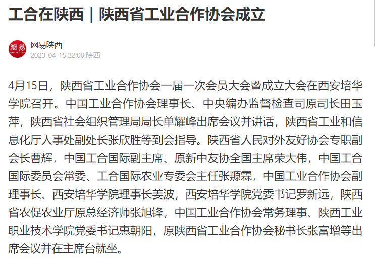 据了解,中国工业合作协会是在中国共产党指导下,由国际友人路易·艾黎、埃德加·斯诺夫妇及爱国民主人士发起,国共两党高层要员参与组建和领导,于1938年8月在武汉成立的。它是国共第二次合作的产物,是中国人民抗日民族统一战线的结晶,也是目前大陆唯一由国共两党共同创办并仍在开展活动的社会组织。陕西省工业合作协会接受陕西省工业和信息化厅和陕西省民政厅的业务指导与监督管理,是由陕西省工业企业及与工业相关的企业单位、事业单位、社会团体及热心工合事业的人士与组织自愿结成的具有先进性、统战性、经济性的社会团体。协会高举中国特色社会主义伟大旗帜,继承工合传统,弘扬工合精神,光大工合事业,坚持政治建会、团结立会、服务兴会、改革强会、从严治会,以工业强省为引领,以合作经济为基础,以民营经济为主体,跨地区、跨行业、跨所有制合作发展,引地区联合之风范,领工业合作之先导,致力于建设成为全省经济社团组织的领航者。