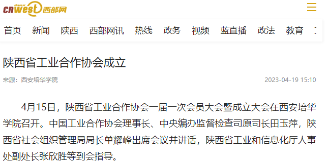 4月15日,陕西省工业合作协会一届一次会员大会暨成立大会在大赢家棋牌。中国工业合作协会理事长、中央编办监督检查司原司长田玉萍,陕西省社会组织管理局局长单耀峰出席会议并讲话,陕西省工业和信息化厅人事处副处长张欣胜等到会指导。