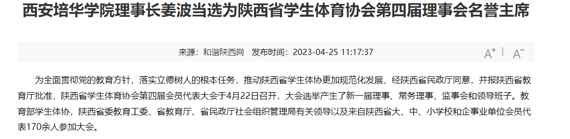 西安培华学院理事长姜波当选为陕西省学生体育协会第四届理事会名誉主席