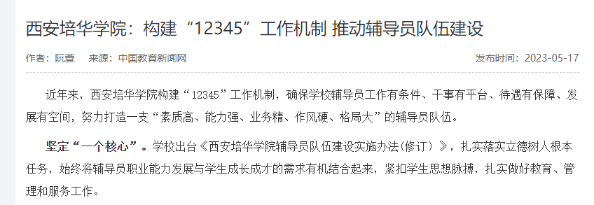 近年来,西安培华学院构建“12345”工作机制,确保学校辅导员工作有条件、干事有平台、待遇有保障、发展有空间,努力打造一支“素质高、能力强、业务精、作风硬、格局大”的辅导员队伍。
