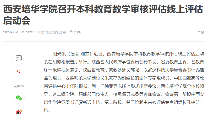阳光讯(记者 刘杰)近日,西安培华学院本科教育教学审核评估线上评估启动会在明德楼报告厅举行。陕西省人民政府学位委员会秘书长、省委教育工委、省教育厅一级巡视员袁宁,陕西省教育厅高教处处长高强,以武汉科技大学原党委书记孔建益为组长、安徽师范大学副校长朱家存为副组长的全体专家组成员,中国西部高等教育评估中心主任陆根书,副主任徐菲等以线上形式出席会议。西安培华学院全体校领导,各二级学院、职能部门负责人,校级督导成员等参加会议。会议第一阶段由西安培华学院党委书记罗新远主持,第二阶段、第三阶段由审核评估专家组组长孔建益主持。