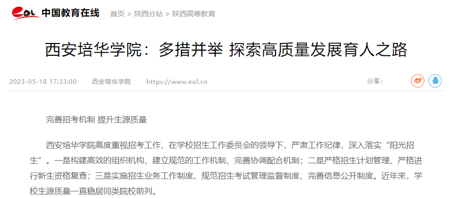 西安培华学院高度重视招考工作,在学校招生工作委员会的领导下,严肃工作纪律,深入落实“阳光招生”。一是构建高效的组织机构、建立规范的工作机制、完善协调配合机制;二是严格招生计划管理、严格进行新生资格复查;三是实施招生业务工作制度、规范招生考试管理监督制度、完善信息公开制度。近年来,学校生源质量一直稳居同类院校前列。
