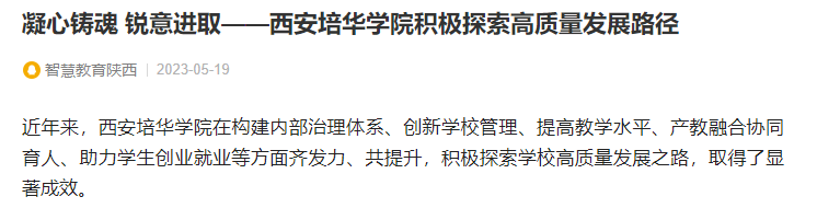 近年来,西安培华学院在构建内部治理体系、创新学校管理、提高教学水平、产教融合协同育人、助力学生创业就业等方面齐发力、共提升,积极探索学校高质量发展之路,取得了显著成效。