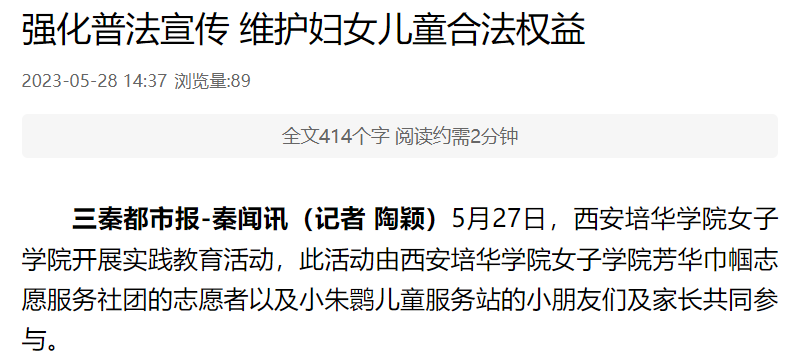 实现好、保障好、维护好法律赋予妇女儿童的合法权益,事关妇女儿童成长进步、社会稳定和千家万户的安宁。通过此次活动,西安培华学院女子学院的志愿者们切实保护了妇女儿童的合法权益,不断提升了当地妇女儿童的获得感、幸福感、安全感,为创造平安、和谐、美丽的王曲村奉献了巾帼力量。