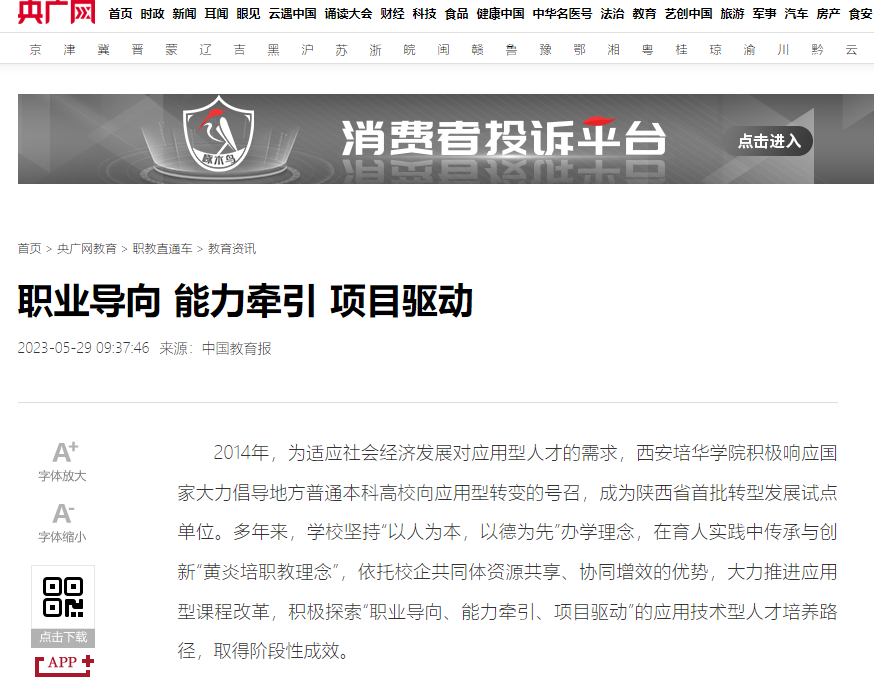 2014年,为适应社会经济发展对应用型人才的需求,西安培华学院积极响应国家大力倡导地方普通本科高校向应用型转变的号召,成为陕西省首批转型发展试点单位。多年来,学校坚持“以人为本,以德为先”办学理念,在育人实践中传承与创新“黄炎培职教理念”,依托校企共同体资源共享、协同增效的优势,大力推进应用型课程改革,积极探索“职业导向、能力牵引、项目驱动”的应用技术型人才培养路径,取得阶段性成效。