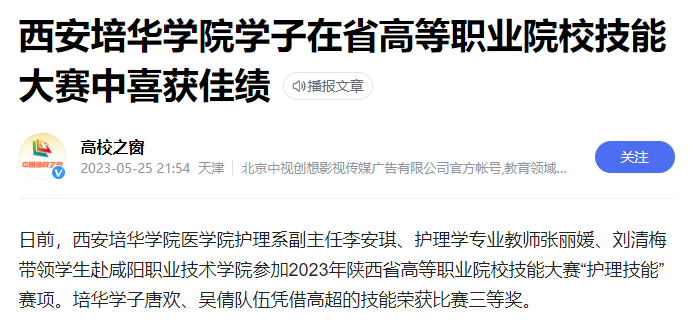 日前,西安培华学院医学院护理系副主任李安琪、护理学专业教师张丽媛、刘清梅带领学生赴咸阳职业技术学院参加2023年陕西省高等职业院校技能大赛“护理技能”赛项。培华学子唐欢、吴倩队伍凭借高超的技能荣获比赛三等奖。