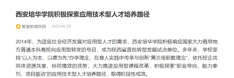 2014年,为适应社会经济发展对应用型人才的需求,西安培华学院积极响应国家大力倡导地方普通本科高校向应用型转变的号召,成为陕西省首批转型发展试点单位。多年来,学校坚持“以人为本,以德为先”办学理念,在育人实践中传承与创新“黄炎培职教理念”,依托校企共同体资源共享、协同增效的优势,大力推进应用型课程改革,积极探索“职业导向、能力牵引、项目驱动”的应用技术型人才培养路径,取得阶段性成效。