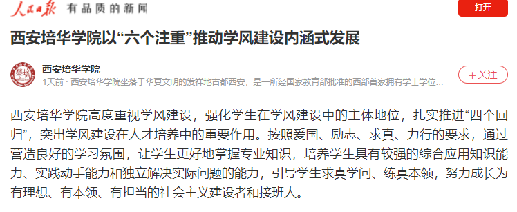 通过一系列举措,西安培华学院学风氛围浓厚、效果显著。经过第三方麦可思数据调查,该校2021-2022学年大一至大四本科学生对本校的学风满意度均为 97%,高于同类院校平均水平。在人才培养目标达成度、社会需求适应度、学生满意度等方面起到了很好的支撑作用。逐步形成了“气象新、校风好、学风浓、班风正”的校园文化格局,不断促进学生的全面发展。(作者:西安培华学院学工部部长 蔡亮)