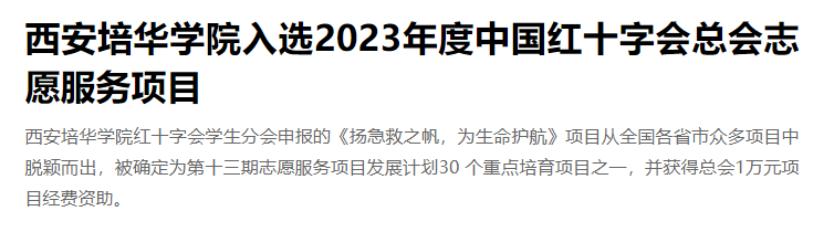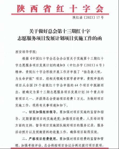 近日,中国红十字会总会办公室发布了《关于实施第十三期红十字志愿服务项目发展计划的通知》,西安培华学院红十字会学生分会申报的《扬急救之帆,为生命护航》项目从全国各省市众多项目中脱颖而出,被确定为第十三期志愿服务项目发展计划30 个重点培育项目之一,并获得总会1万元项目经费资助。