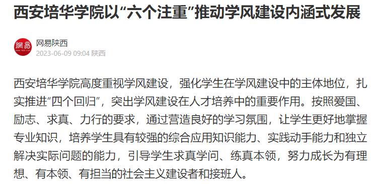 西安培华学院高度重视学风建设,强化学生在学风建设中的主体地位,扎实推进“四个回归”,突出学风建设在人才培养中的重要作用。按照爱国、励志、求真、力行的要求,通过营造良好的学习氛围,让学生更好地掌握专业知识,培养学生具有较强的综合应用知识能力、实践动手能力和独立解决实际问题的能力,引导学生求真学问、练真本领,努力成长为有理想、有本领、有担当的社会主义建设者和接班人。