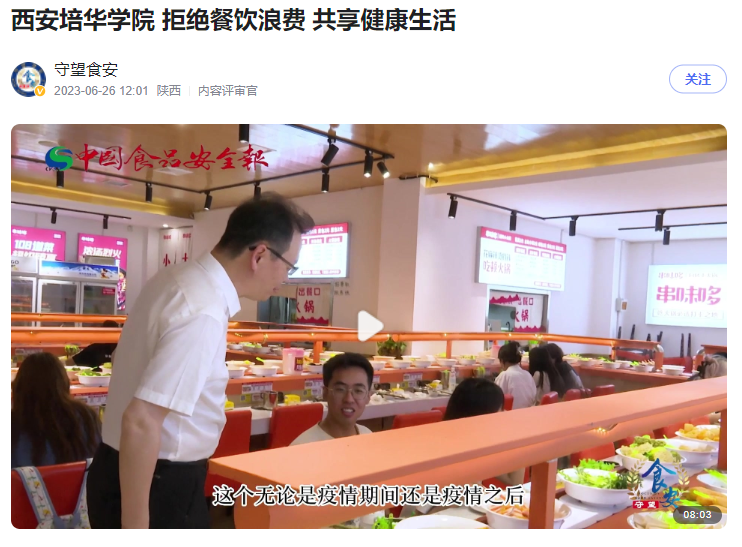 记者出镜:各位观众,大家好,2023中国食品安全报“食品安全进校园”系列报道,今天来到了西安培华学院,作为全国首家走向百年的民办高校,立足于此定有他的奠基与特色,今天就让我带您走进培华,一起去了解一下他们是如何做好校园食品安全。