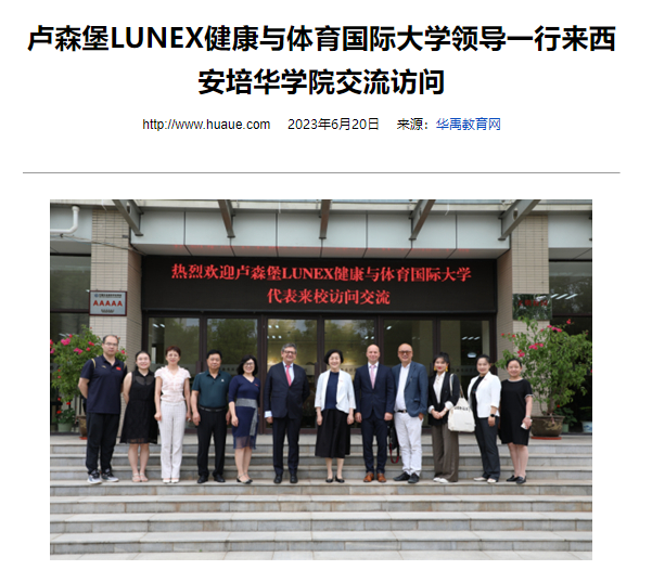 6月16日下午,卢森堡LUNEX健康与体育国际大学董事会成员Andreas Mierau博士、独立董事詹勇先生、董事会律师Theisen Marc先生等代表莅临西安培华学院交流访问。西安培华学院副校长刘越莲、国际交流中心王鹏主任、体育学院王志强院长、医学院王菊宁副院长、产业经济研究中心孙文琳副主任等与来访嘉宾座谈并陪同参观。